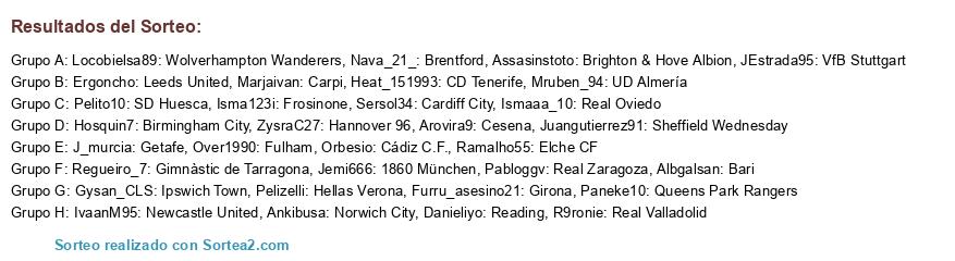 Lista de participantes: Assasinstoto: Brighton & Hove Albion, JEstrada95: VfB Stuttgart, Over1990: Fulham, Danieliyo: Reading, R9ronie: Real Valladolid, IvaanM95: Newcastle United, Juangutierrez91: Sheffield Wednesday, Gysan_CLS: Ipswich Town, Nava_21_: Brentford, Albgalsan: Bari, Pabloggv: Real Zaragoza, J_murcia: Getafe, Furru_asesino21: Girona, Isma123i: Frosinone, Ramalho55: Elche CF, Orbesio: Cádiz C.F., Marjaivan: Carpi, Pelizelli: Hellas Verona, Arovira9: Cesena, Hosquin7: Birmingham City, Regueiro_7: Gimnàstic de Tarragona, Sersol34: Cardiff City, Mruben_94: UD Almería, Ankibusa: Norwich City, Ergoncho: Leeds United, ZysraC27: Hannover 96, Paneke10: Queens Park Rangers, Pelito10: SD Huesca, Heat_151993: CD Tenerife, Locobielsa89: Wolverhampton Wanderers, Ismaaa_10: Real Oviedo, Jemi666: 1860 München.