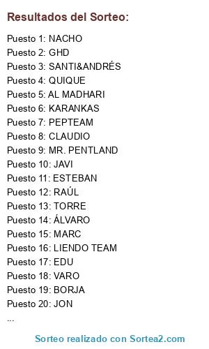 Lista de participantes: MR. PENTLAND, NACHO, ÁLVARO, VARO, HER&PER, LIENDO TEAM, EDU, GHD, JAVI, RAÚL, JON, KARANKAS, MARC, AL MADHARI, TORRE, SANTI&ANDRÉS, CLAUDIO, MARKINA TEAM, PEPTEAM, ESTEBAN, BORJA, QUIQUE.