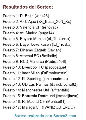 Lista de participantes: Manchester Utd (alfitantalo), RCD Mallorca (Pedro2408), Liverpool FC (pacopaquet), At. Madrid (puga14), Arsenal FC (Bmihalic), Borussia Dortmund (ismaeljimva), Bayern Munich (el_Thatanka), AFC Ajax (xX_BaLa_XoN_Xx), Málaga CF (IVANIZQUIERDO), Inter Milan (DrFronkonstin), R. Madrid CF (Montxo91), UD Las Palmas (davidbrocha82), R. Betis (wisa23), Valencia CF (renovac), R. Sporting (juniorcodema), Bayer Leverkusen (El_Troska), Dinamo Zagreb (Javian).
