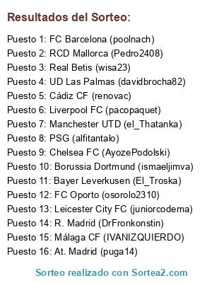 Lista de participantes: PSG (alfitantalo), RCD Mallorca (Pedro2408), Liverpool FC (pacopaquet), At. Madrid (puga14), Málaga CF (IVANIZQUIERDO), Manchester UTD (el_Thatanka), Cádiz CF (renovac), FC Barcelona (poolnach), FC Oporto (osorolo2310), R. Madrid (DrFronkonstin), Leicester City FC (juniorcodema), UD Las Palmas (davidbrocha82), Borussia Dortmund (ismaeljimva), Real Betis (wisa23), Bayer Leverkusen (El_Troska), Chelsea FC (AyozePodolski).
