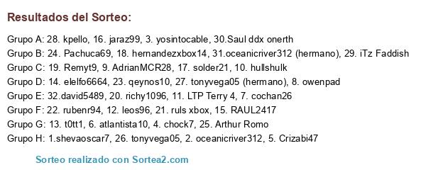 Lista de participantes: 1.shevaoscar7, 2. oceanicriver312, 3. yosintocable, 4. chock7, 5. Crizabi47, 6. atlantista10, 7. cochan26, 8. owenpad, 9. AdrianMCR28, 10. hullshulk, 11. LTP Terry 4, 12. leos96, 13. t0tt1, 14. elelfo6664, 15. RAUL2417, 16. jaraz99, 17. solder21, 18. hernandezxbox14, 19. Remyt9, 20. richy1096, 21. ruls xbox, 22. rubenr94, 23. qeynos10, 24. Pachuca69, 25. Arthur Romo, 26. tonyvega05, 27. tonyvega05 (hermano), 28. kpello, 29. iTz Faddish, 30.Saul ddx onerth, 31.oceanicriver312 (hermano), 32.david5489.