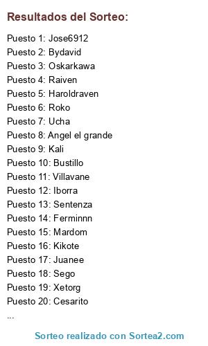 Lista de participantes: Angel el grande, Betico, Bustillo, Bydavid, Cape, Cesarito, Er Pollito, Ferminnn, Haroldraven, Iborra, Ipillo, Jose6912, Juanee, Kali, Kikote, King Magic, Liñan, Mardom, Nugetown, Osdobla, Oskarkawa, Padrone, Pepeastur, Raiven, Roko, Ru Cortes, Sego, Sentenza, Sullendonkey, Ucha, Villavane, Xetorg.