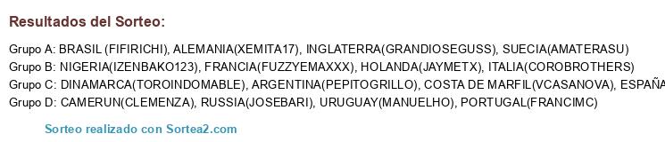 Lista de participantes: ESPAÑA (OVERPICK), INGLATERRA(GRANDIOSEGUSS), BRASIL (FIFIRICHI), ARGENTINA(PEPITOGRILLO), ITALIA(COROBROTHERS), FRANCIA(FUZZYEMAXXX), PORTUGAL(FRANCIMC), HOLANDA(JAYMETX), ALEMANIA(XEMITA17), CAMERUN(CLEMENZA), RUSSIA(JOSEBARI), SUECIA(AMATERASU), NIGERIA(IZENBAKO123), URUGUAY(MANUELHO), COSTA DE MARFIL(VCASANOVA), DINAMARCA(TOROINDOMABLE).