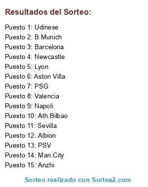 Lista de participantes: Albion, Anzhi, Aston Villa, Ath.Bilbao, B.Munich, Barcelona, Lyon, Man.City, Napoli, Newcastle, PSG, PSV, Sevilla, Udinese, Valencia.