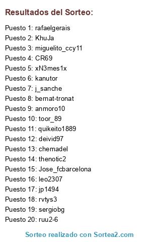 Lista de participantes: toor_89, leo2307, rvtys3, kanutor, miguelito_ccy11, Jose_fcbarcelona, xN3mes1x, jp1494, thenotic2, quikeito1889, deivid97, j_sanche, ruu2-6, KhuJa, sergiobg, CR69, rafaelgerais, anmoro10, bernat-tronat, chemadel.