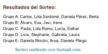 Lista de participantes: Stephanie, Javi, Berta, Irene, Carlos, Álvaro, Paula, Laura, Eva, Daniela Pérez, Daniela Pliego, Esther, Daniela Rincón, Livia, Lola Romo, Aroa, Lola Santomé, Gabriela, Lucía.