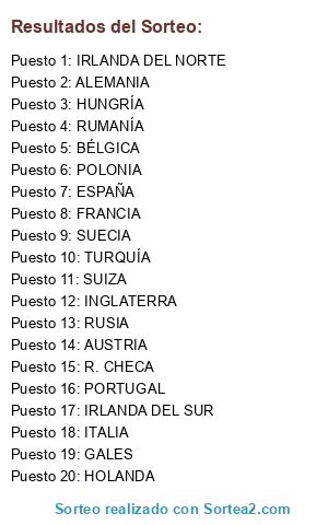 Lista de participantes: FRANCIA, RUMANÍA, SUIZA, INGLATERRA, RUSIA, GALES, ALEMANIA, POLONIA, IRLANDA DEL NORTE, ESPAÑA, R. CHECA, TURQUÍA, BÉLGICA, ITALIA, IRLANDA DEL SUR, SUECIA, AUSTRIA, HUNGRÍA, PORTUGAL, HOLANDA.