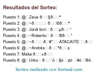 Lista de participantes: @Urko 🏴, Maka 🇫🇷, @~😍🥰❤️ATACAITE❤️😍🥰 🇪🇸, @~👍 🇩🇪, @Jordi bcn 🇵🇹, @~Andrés 🇳🇱, @~Roberto 🇮🇹, @Zeus 🇧🇪.