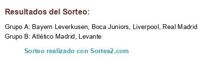 Lista de participantes: Liverpool, Boca Juniors, Bayern Leverkusen, Real Madrid, Atlético Madrid, Levante.