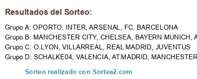 Lista de participantes: REAL MADRID, FC. BARCELONA, AT.MADRID, VALENCIA, VILLARREAL, CHELSEA, MANCHESTER UNITED, MANCHESTER CITY, ARSENAL, BAYERN MUNICH, SCHALKE04, AC. MILAN, INTER, JUVENTUS, O.LYON, OPORTO.