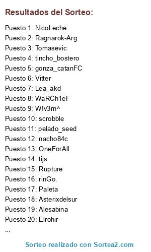 Lista de participantes: Alesabina, Rupture, c1ruja, WaRCh1eF, Elrohir, Boogie (EA), Asterixdelsur, Paleta, W!v3rn^, nacho84c, pelado_seed, rinGo., Tomasevic, Lea_akd, tincho_bostero, NicoLeche, ljungberg, Nicomap, gonza_catanFC, Ragnarok-Arg, Vitter, scrobble, tijs, OneForAll.