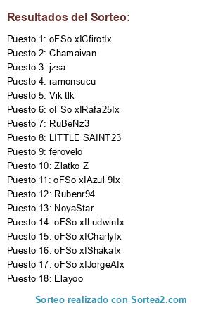 Lista de participantes: oFSo xILudwinIx, NoyaStar, Rubenr94, oFSo xIJorgeAIx, oFSo xICharlyIx, oFSo xICfirotIx, oFSo xIRafa25Ix, oFSo xIShakaIx, ferovelo, jzsa, Chamaivan, Zlatko Z, LITTLE SAINT23, oFSo xIAzul 9Ix, Elayoo, ramonsucu, Vik tlk, RuBeNz3.