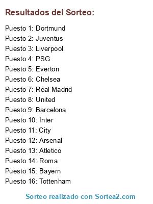 Lista de participantes: PSG, Juventus, Liverpool, Arsenal, Barcelona, Dortmund, Inter, City, Bayern, Chelsea, United, Tottenham, Roma, Real Madrid, Everton, Atletico.