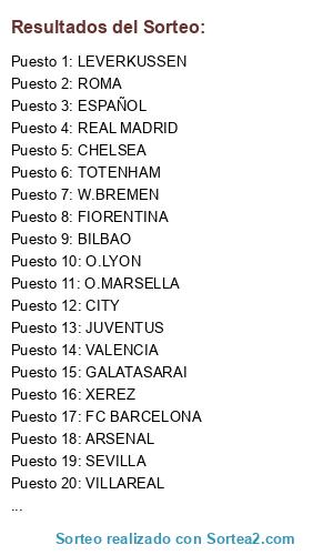 Lista de participantes: REAL MADRID, O.MARSELLA, W.BREMEN, OPORTO, BILBAO, GALATASARAI, SEVILLA, DORTMUND, FC BARCELONA, ARSENAL, FIORENTINA, VALENCIA, ROMA, ESPAÑOL, SHALKE, JUVENTUS, MILÁN, CITY, CHELSEA, VILLA, O.LYON, BAYERN, XEREZ, LEVERKUSSEN, M.UNITED, TOTENHAM, INTER DE MILÁN, VILLAREAL.