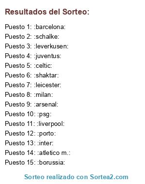 Lista de participantes: :barcelona:, :juventus:, :psg:, :arsenal:, :borussia:, :atletico m.:, :celtic:, :inter:, :liverpool:, :milan:, :porto:, :schalke:, :leverkusen:, :leicester:, :shaktar:.