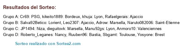 Lista de participantes: kikeito1889: Bordeux, khuja: Lyon, dieguitovk: Marsella, Cr69: PSG, Leo2307: Ajaccio, Salva92Betico: Lorient, JP1494: Niza, Roberto_Leganes: Nancy, Yosyone: Brest, Adrow: Marsella, Ruuben96: Bastia, Sbgamt: Toulouse, Rafaelgerais: Ajaccio, Naruto082006: Saint-Etienne, Manu92gs: Lyon, Anmoro10: Valenciennes.