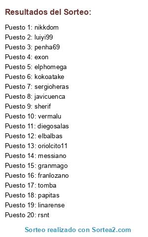 Lista de participantes: penha69, oriolcito11, luiyi99, sergioheras, elphomega, granmago, elbalbas, diegosalas, franlozano, rsnt, papitas, linarense, nikkdom, sherif, vermalu, exon, kokoatake, messiano, javicuenca, tomba.