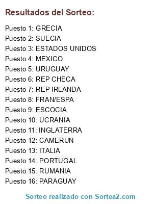 Lista de participantes: ESPAÑA, ALEMANIA, BRASIL, FRANCIA, ARGENTINA, PORTUGAL, BELGICA, ITALIA, INGLATERRA, HOLANDA, URUGUAY, MEXICO, SUIZA, POLONIA, CHILE, COLOMBIA, TURQUIA, RUSIA, DINAMARCA, AUSTRIA, COSTA DE MARFIL, GALES, GRECIA, ESTADOS UNIDOS, SUECIA, CAMERUN, ESLOVENIA, REP.CHECA, ECUADOR, SUDAFRICA, RUMANIA, RP. CHINA.