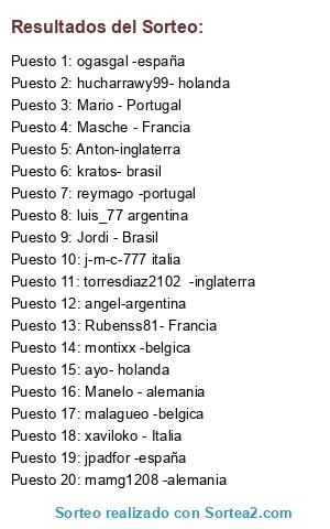 Lista de participantes: Masche - Francia, Jordi - Brasil, Mario - Portugal, Manelo - alemania, Rubenss81- Francia, kratos- brasil, Anton-inglaterra, malagueo -belgica, torresdiaz2102 -inglaterra, montixx -belgica, jpadfor -españa, ogasgal -españa, reymago -portugal, angel-argentina, luis_77 argentina, mamg1208 -alemania, xaviloko - Italia, j-m-c-777 italia, hucharrawy99- holanda, ayo- holanda.