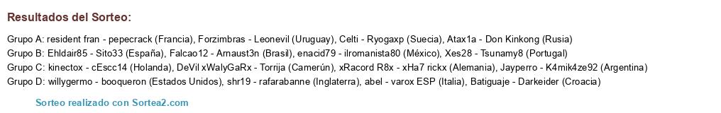 Lista de participantes: Batiguaje - Darkeider (Croacia), Forzimbras - Leonevil (Uruguay), enacid79 - ilromanista80 (México), Jayperro - K4mik4ze92 (Argentina), kinectox - cEscc14 (Holanda), Atax1a - Don Kinkong (Rusia), DeVil xWalyGaRx - Torrija (Camerún), Falcao12 - Arnaust3n (Brasil), Ehldair85 - Sito33 (España), Xes28 - Tsunamy8 (Portugal), shr19 - rafarabanne (Inglaterra), resident fran - pepecrack (Francia), Celti - Ryogaxp (Suecia), willygermo - booqueron (Estados Unidos), xRacord R8x - xHa7 rickx (Alemania), abel - varox ESP (Italia).