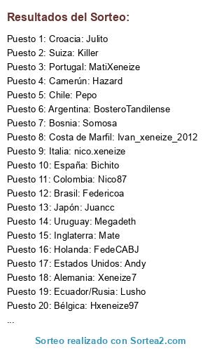 Lista de participantes: Brasil: Federicoa, Croacia: Julito, Camerún: Hazard, España: Bichito, Holanda: FedeCABJ, Chile: Pepo, Colombia: Nico87, Costa de Marfil: Ivan_xeneize_2012, Japón: Juancc, Uruguay: Megadeth, Inglaterra: Mate, Italia: nico.xeneize, Suiza: Killer, Ecuador/Rusia: Lusho, Francia: BosteroBallester, Argentina: BosteroTandilense, Bosnia: Somosa, Alemania: Xeneize7, Portugal: MatiXeneize, Estados Unidos: Andy, Bélgica: Hxeneize97.