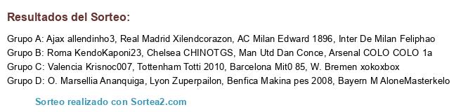 Lista de participantes: Inter De Milan Feliphao, AC Milan Edward 1896, Roma KendoKaponi23, Man Utd Dan Conce, Chelsea CHINOTGS, Tottenham Totti 2010, Arsenal COLO COLO 1a, Real Madrid Xilendcorazon, Barcelona Mit0 85, Valencia Krisnoc007, Bayern M AloneMasterkelo, Benfica Makina pes 2008, Ajax allendinho3, Lyon Zuperpailon, O. Marsellia Ananquiga, W. Bremen xokoxbox.