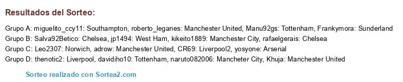 Lista de participantes: Manu92gs: Tottenham, adrow: Manchester United, miguelito_ccy11: Southampton, jp1494: West Ham, Frankymora: Sunderland, rafaelgerais: Chelsea, Leo2307: Norwich, kikeito1889: Manchester City, CR69: Liverpool2, Salva92Betico: Chelsea, davidiho10: Tottenham, thenotic2: Liverpool, roberto_leganes: Manchester United, yosyone: Arsenal, naruto082006: Mancheter City, Khuja: Manchester United.