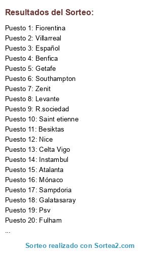 Lista de participantes: Mónaco, Saint etienne, Ajax Amsterdam, Zenit, Tottenham, Leicester, Crystal Palace, Torino, Benfica, Oporto, S.portugal, Sevilla CF, Besiktas, Galatasaray, Atalanta, Lokomotiv, Betis, Villarreal, R.sociedad, Athletic, Fiorentina, Psv, Feberbache, Schaktar, Southampton, Sparta mosku, Celta Vigo, Sampdoria, Fulham, Instambul, Nantes, Nice, Español, Getafe, Levante, Girona.