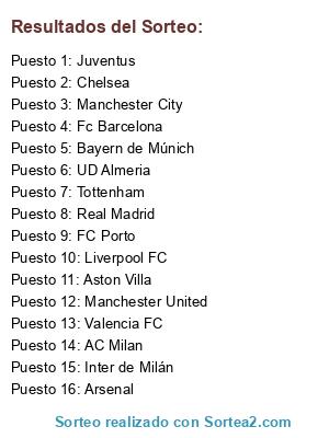 Lista de participantes: Real Madrid, Tottenham, Fc Barcelona, Juventus, AC Milan, Arsenal, Inter de Milán, Manchester United, Manchester City, Liverpool FC, Valencia FC, UD Almeria, FC Porto, Aston Villa, Bayern de Múnich, Chelsea.