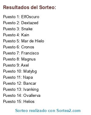 Lista de participantes: Magnus, Napa, ElfOscuro, Mar de Hielo, Dextazed, Snake, Bancar, Ovallerva, Francisco, Matybg, Cronos, Axel, Kain, Ivanking, Helios.