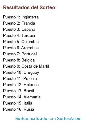Lista de participantes: España, Brasil, Alemania, Holanda, Italia, Argentina, Portugal, Inglaterra, Uruguay, Francia, Colombia, Belgica, Rusia, Costa de Marfil, Polonia, Turquia.
