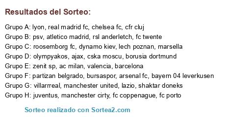Lista de participantes: real madrid fc, partizan belgrado, lech poznan, fc coppenague, roosemborg fc, rsl anderletch, dynamo kiev, cska moscu, manchester cirty, atletico madrid, fc twente, manchester united, chelsea fc, arsenal fc, barcelona, villarrreal, valencia, ac milan, juventus, lazio, borusia dortmund, bayern 04 leverkusen, lyon, marsella, psv, ajax, shaktar doneks, cfr cluj, zenit sp, fc porto, bursaspor, olympyakos.