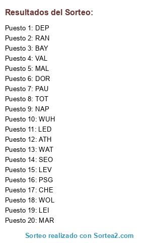 Lista de participantes: CHE, VAL, LEV, DOR, MAR, RAN, BAY, PSG, WUH, PAU, WAT, TOT, WOL, DEP, MAL, SEO, LEI, LED, NAP, ATH.