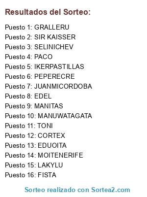 Lista de participantes: PACO, MANUWATAGATA, JUANMICORDOBA, SIR KAISSER, GRALLERU, PEPERECRE, MOITENERIFE, CORTEX, TONI, EDEL, SELINICHEV, LAKYLU, MANITAS, EDUOITA, IKERPASTILLAS, FISTA.