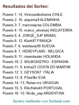 Lista de participantes: 1. HERDYFLA85 - BELGICA, 2. WILMONSTRO - ESPANHA, 3. GEYSON7 ITALIA, 4. JORGE_SJP BRASIL, 5. RikcNeto40 PORTUGAL, 6. wesleyxa99 SUECIA, 7. marcioayres COLOMBIA, 8. P3es9br EUA, 9. kinha23 COSTA DO MARFIM, 10. Ricão_sep ARGENTINA, 11. rosenkaster HOLANDA, 12. Klark87 FRANÇA, 13. Ratao-crz URUGUAI, 14. Viniciusdeoliveira CHILE, 15. marco_oliveirarj INGLATERRA, 16. alquimia9 ALEMANHA.