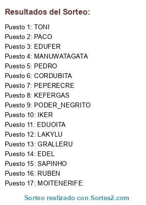 Lista de participantes: PACO, RUBEN, MANUWATAGATA, PEDRO, IKER, EDUOITA, TONI, MOITENERIFE, PODER_NEGRITO, KEFERGAS, EDUFER, SAPINHO, CORDUBITA, LAKYLU, PEPERECRE, EDEL, GRALLERU.