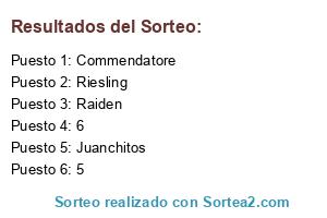 Lista de participantes: Riesling, Commendatore, Juanchitos, Raiden, 5, 6.