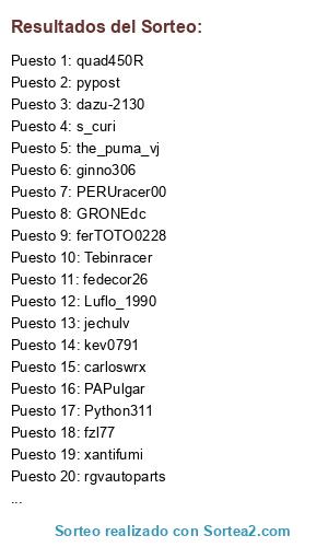 Lista de participantes: the_puma_vj, Tebinracer, s_curi, pypost, fedecor26, PERUracer00, rgvautoparts, quad450R, shamakito12, Python311, Bombardero77, Luflo_1990, Zulu_11, wrx_peru, jechulv, fzl77, guerra86obg, kev0791, PTY-Rubn23, ferTOTO0228, ginno306.