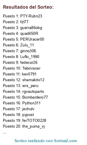 Lista de participantes: the_puma_vj, Tebinracer, s_curi, pypost, fedecor26, PERUracer00, rgvautoparts, quad450R, shamakito12, Python311, Bombardero77, Luflo_1990, Zulu_11, wrx_peru, jechulv, fzl77, guerra86obg, kev0791, PTY-Rubn23, ferTOTO0228, ginno306.