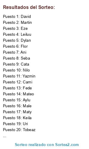 Lista de participantes: Tobeaz, David, Lucas, Lucia, Bruno, Seba, Cami, Ani, Rochii, Lau, Martin, Luchy, Fran, Leiluu, Dylan, Aylu, Yazmin, Maty, Uri, Male, Keila, Fede, Mateo, Flor, Cata, Arian, Nilo, Maga, Agus, Eze, Mati F., Joaco.