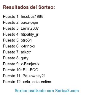 Lista de participantes: Lenin2307, x-Benjax-x, fitipaldy_jr, otro34, EL_FCO, arkptr, xela_colo-colino, baez-pipe, guty, Incubus1988, x-trino-x, Paulowsky21.