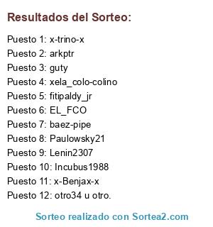 Lista de participantes: arkptr, x-trino-x, xela_colo-colino, x-Benjax-x, baez-pipe, guty, fitipaldy_jr, Incubus1988, EL_FCO, Paulowsky21, Lenin2307, otro34 u otro..