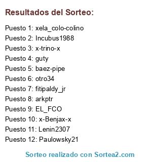 Lista de participantes: EL_FCO, otro34, xela_colo-colino, Lenin2307, fitipaldy_jr, x-trino-x, x-Benjax-x, arkptr, Incubus1988, guty, baez-pipe, Paulowsky21.