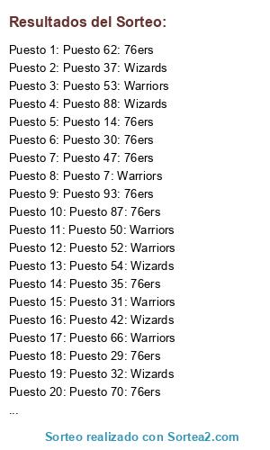 Lista de participantes: Puesto 1: 76ers, Puesto 2: Warriors, Puesto 3: 76ers, Puesto 4: 76ers, Puesto 5: Warriors, Puesto 6: Wizards, Puesto 7: Warriors, Puesto 8: Warriors, Puesto 9: Warriors, Puesto 10: Wizards, Puesto 11: Warriors, Puesto 12: Wizards, Puesto 13: Warriors, Puesto 14: 76ers, Puesto 15: 76ers, Puesto 16: Wizards, Puesto 17: Wizards, Puesto 18: Warriors, Puesto 19: 76ers, Puesto 20: Warriors, Puesto 21: Warriors, Puesto 22: 76ers, Puesto 23: Warriors, Puesto 24: 76ers, Puesto 25: Wizards, Puesto 26: 76ers, Puesto 27: 76ers, Puesto 28: Wizards, Puesto 29: 76ers, Puesto 30: 76ers, Puesto 31: Warriors, Puesto 32: Wizards, Puesto 33: Wizards, Puesto 34: Wizards, Puesto 35: 76ers, Puesto 36: Wizards, Puesto 37: Wizards, Puesto 38: Warriors, Puesto 39: 76ers, Puesto 40: 76ers, Puesto 41: Warriors, Puesto 42: Wizards, Puesto 43: Wizards, Puesto 44: Wizards, Puesto 45: 76ers, Puesto 46: Wizards, Puesto 47: 76ers, Puesto 48: Wizards, Puesto 49: 76ers, Puesto 50: Warriors, Puesto 51: Wizards, Puesto 52: Warriors, Puesto 53: Warriors, Puesto 54: Wizards, Puesto 55: Warriors, Puesto 56: 76ers, Puesto 57: 76ers, Puesto 58: Wizards, Puesto 59: 76ers, Puesto 60: 76ers, Puesto 61: 76ers, Puesto 62: 76ers, Puesto 63: 76ers, Puesto 64: Warriors, Puesto 65: 76ers, Puesto 66: Warriors, Puesto 67: Warriors, Puesto 68: Warriors, Puesto 69: Warriors, Puesto 70: 76ers, Puesto 71: Warriors, Puesto 72: 76ers, Puesto 73: Warriors, Puesto 74: Warriors, Puesto 75: Wizards, Puesto 76: Wizards, Puesto 77: Warriors, Puesto 78: 76ers, Puesto 79: Wizards, Puesto 80: 76ers, Puesto 81: 76ers, Puesto 82: Warriors, Puesto 83: 76ers, Puesto 84: Warriors, Puesto 85: Warriors, Puesto 86: Wizards, Puesto 87: 76ers, Puesto 88: Wizards, Puesto 89: Warriors, Puesto 90: Warriors, Puesto 91: Wizards, Puesto 92: Warriors, Puesto 93: 76ers, Puesto 94: 76ers, Puesto 95: 76ers.