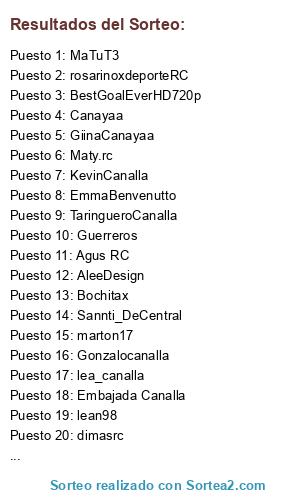 Lista de participantes: lean98, Maty.rc, lea_canalla, Gonzalocanalla, MaTuT3, KevinCanalla, lukasss, TaringueroCanalla, Bochitax, Canayaa, marton17, Embajada Canalla, EmmaBenvenutto, Cajita Feliz, Sannti_DeCentral, Manu_Lakd_14, dimasrc, BestGoalEverHD720p, AleeDesign, drugo, GiinaCanayaa, Agus RC, Guerreros, rosarinoxdeporteRC.