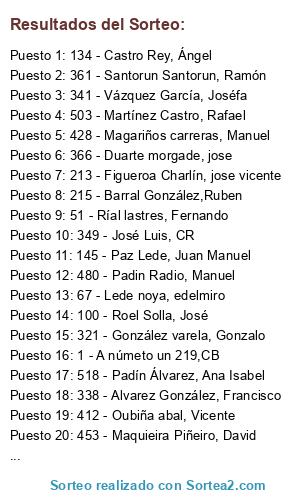 Lista de participantes: 372 - Santos Portas, Jose Maris, 376 - Varela Abal, Javier, 421 - Glaser Lede, Miguel, 439 - Iglesias Rivas, teresa, 278 - Dominguez Padin ,Jose, 426 - Juncal Portas, Marta María, 176 - Piñeiro señorans, Luis santiago, 134 - Castro Rey, Ángel, 22 - dominguez padin , manuel, 156 - Carrión Álvarez, Carlos, 485 - González pomares, Benito, 514 - Martínez González, María Jesús, 51 - Ríal lastres, Fernando, 85 - Santamaria juncal, Mercedes, 62 - Rodríguez Vázquez, Alberto, 501 - VARELA COUSIDO, LOURDES, 297 - Gómez Crespo, José Manuel, 477 - Sineiro García, Miguel, 507 - Mayan Garrido, David, 351 - padín Cortez,severo, 202 - Dios Garcia, Dolores, 452 - Bouzada Piñeiro, Rodrigo, 195 - Otero fariña,s.c., 189 - Buceta,alfonsin,Rosa, 495 - Vázquez Vázquez-Núñez, Rafael, 129 - Martinez Gonzalez, Rosa, 128 - Prado Martinez,Maria Jesus, 425 - Martínez lede, Carmen, 339 - Oubiña Chaves, Maximino, 266 - Varela oubiña, Rosa, 262 - Feijoó Falcón, Jesús, 504 - Buceta Otero, gumersindo, 462 - Varela cousido, gabino, 166 - Chaves Patiño, Jorge, 480 - Padin Radio, Manuel, 428 - Magariños carreras, Manuel, 447 - Farina Dopazo, Genoveva, 411 - Vila otero,Carmen, 79 - Reguera Abal, Peregrina, 174 - Platis Cores, Antonio, 355 - Prado Agra, Olalla, 412 - Oubiña abal, Vicente, 366 - Duarte morgade, jose, 216 - comun, 173 - Padin Vieites, Manuel, 5 - FAMILIA FONTAN TRONCOSO,CB, 145 - Paz Lede, Juan Manuel, 215 - Barral González,Ruben, 224 - Torres Padín, José Angel, 158 - Casal Escudero ,M. Celia, 446 - Somoza piñeiro, José luis, 47 - Ruibal costa, María ines, 377 - Viñedos Reina, cb, 423 - Muñiz López, eva, 282 - García fariña, carmen, 506 - Suárez Chaves, Marina, 341 - Vázquez García, Joséfa, 46 - Villar Fariña, Socorro, 213 - Figueroa Charlín, jose vicente, 518 - Padín Álvarez, Ana Isabel, 7 - Dadín Padín, María Mercedes, 460 - Besada González, María José, 306 - Feijoo Padin,Luisa, 311 - PADIN GARCIA, CARMEN, 116 - Varela Martinez, Raquel, 164 - Rey camiña,manuel, 519 - Barreiro Martinez ,Milagros, 96 - leal doval, rosa maria, 359 - Fandiño Salgueiro, Antonio, 4 - Pita, carmen, 1 - A númeto un 219,CB, 321 - González varela, Gonzalo, 67 - Lede noya, edelmiro, 483 - Paz Pérez, Carmelo, 342 - Vidal meis, francisco martin, 361 - Santorun Santorun, Ramón, 503 - Martínez Castro, Rafael, 336 - Outeda Outeda, María Pilar, 207 - Soutullo Fernandez, Jesus, 433 - Martínez Fontan, Luciano, 453 - Maquieira Piñeiro, David, 100 - Roel Solla, José, 427 - Vidal Leiras, Pio, 310 - Casal Vázquez, Sonia, 244 - Martínez Menino,Ero, 280 - Eirín Leal, Isidro, 338 - Alvarez González, Francisco, 492 - Vidal torres,santiago, 140 - Touriño reboredo, javier, 371 - Vázquez grande, antonio, 396 - Villanueva abal, adoracion, 497 - Barreiro Gómez, jesus, 246 - Arez Vázquez, Miguel, 105 - PEÓN PAZ, MARÍA ESTHER, 356 - Hermanos sabaris prado, cb, 142 - Portas Gonzalez, Carlos, 125 - Eladio, CR, 349 - José Luis, CR, 347 - Vila. CR, 63 - TORRES GARCÍA, ELENA, 181 - AROSA VILLAR, MANUEL ENRIQUE.