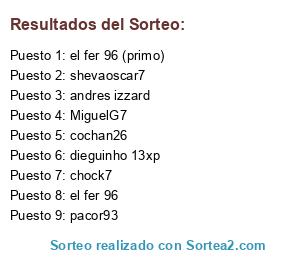 Lista de participantes: el fer 96, el fer 96 (primo), shevaoscar7, cochan26, pacor93, andres izzard, dieguinho 13xp, chock7, MiguelG7.