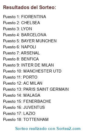 Lista de participantes: AC MILAN, ARSENAL, BARCELONA, BAYER MUNCHEN, BENFICA, CHELSEA, FENERBACHE, FIORENTINA, INTER DE MILAN, JUVENTUS, LAZIO, LYON, MALAGA, MANCHESTER UTD, NAPOLI, PARIS SAINT GERMAIN, PORTO, TOTTENHAM, .