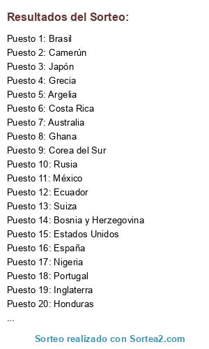 Lista de participantes: Alemania, Chile, Estados Unidos, Japón, Argelia, Colombia, Francia, México, Argentina, Corea del Sur, Ghana, Nigeria, Australia, Costa de Marfil, Grecia, Países Bajos, Bélgica, Costa Rica, Honduras, Portugal, Bosnia y Herzegovina, Croacia, Inglaterra, Rusia, Brasil, Ecuador, Irán, Suiza, Camerún, España, Italia, Uruguay.