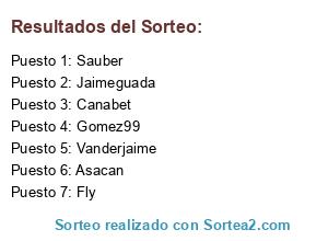 Lista de participantes: Jaimeguada, Vanderjaime, Canabet, Gomez99, Asacan, Sauber, Fly.